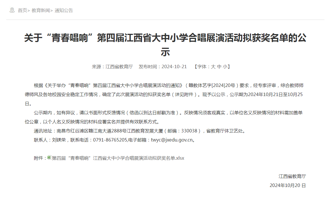 近日,由江西省教育廳主辦的“青春唱響”第四屆江西省大中小學(xué)合唱展演活動(dòng)結(jié)果公布。我校藝術(shù)團(tuán)王振清老師指導(dǎo)的合唱曲目《老師,我想對(duì)你說》《唱支山歌給黨聽》榮獲大學(xué)生乙組三等獎(jiǎng)。